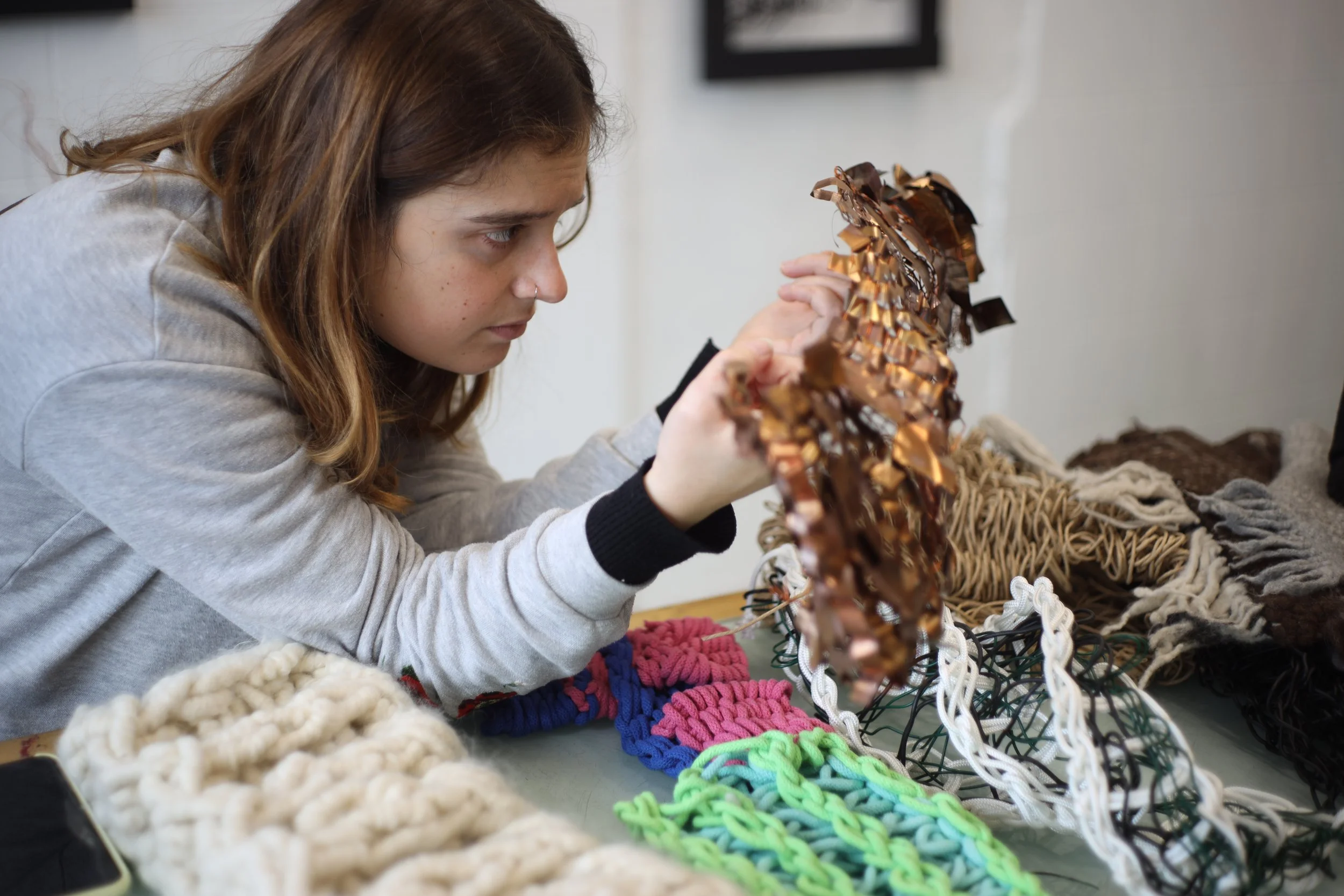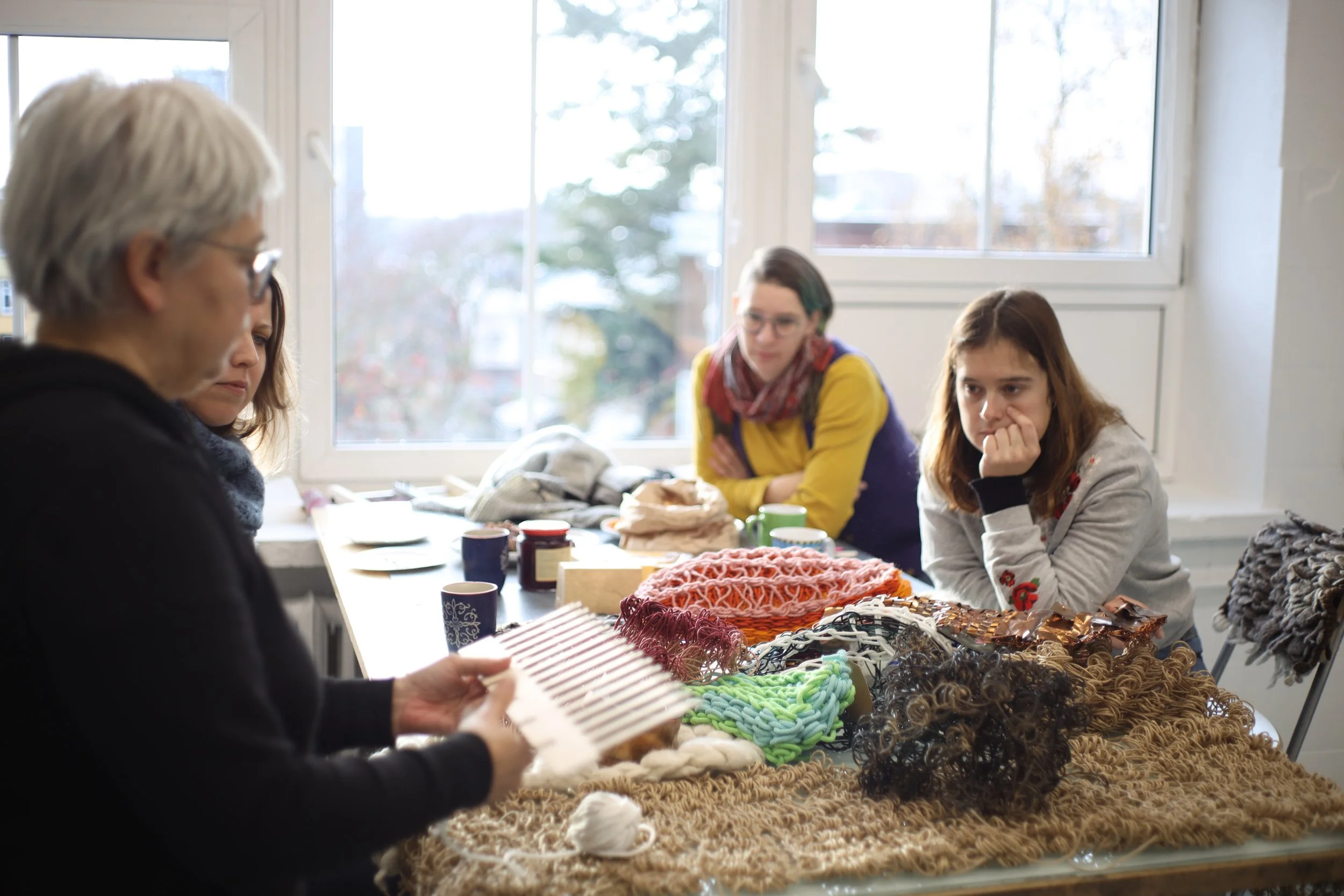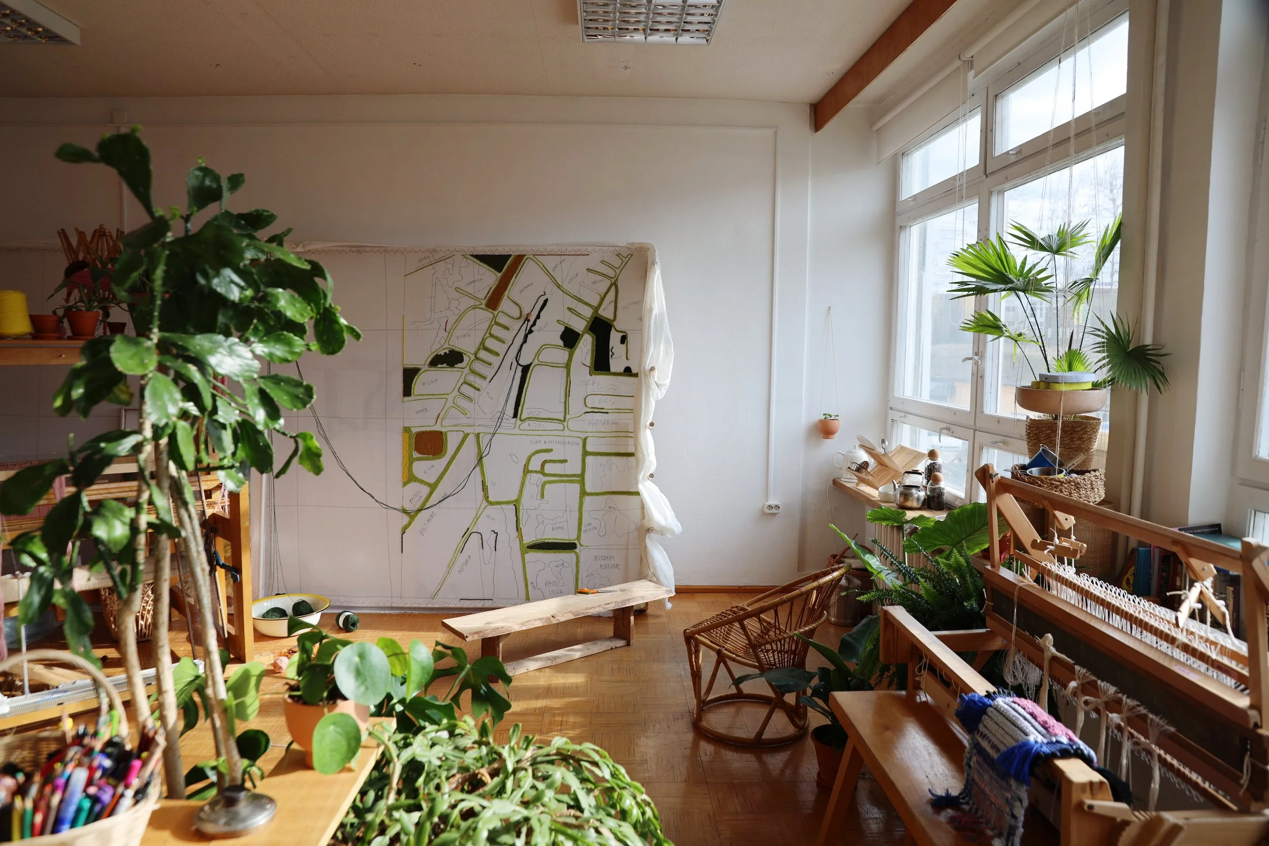 The well-equipped studio provides access to sewing machines, a tufting gun, two large weaving looms (up to 400 × 200 cm), a knitting machine, punch needle tools, and a wide selection of basic materials such as yarn, wire, glue, paper, and paint. Artists can also explore the Textile Tool Library.